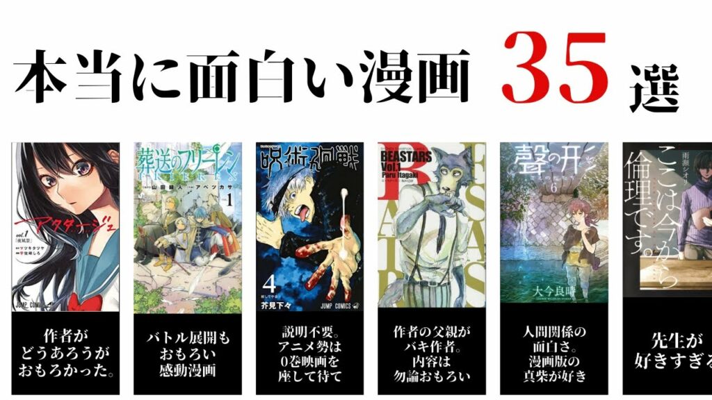 Share Facebook Twitter Pinterest Reddit WhatsApp Email 漫画買ったあと帰り道のワクワク感が好きです。 おすすめ漫画一覧 BGM 甘茶の音楽工房 様 https://amachamusic.chagasi.com/ #呪術廻戦 #ビースターズ #葬送のフリーレン 漫画 ランキング